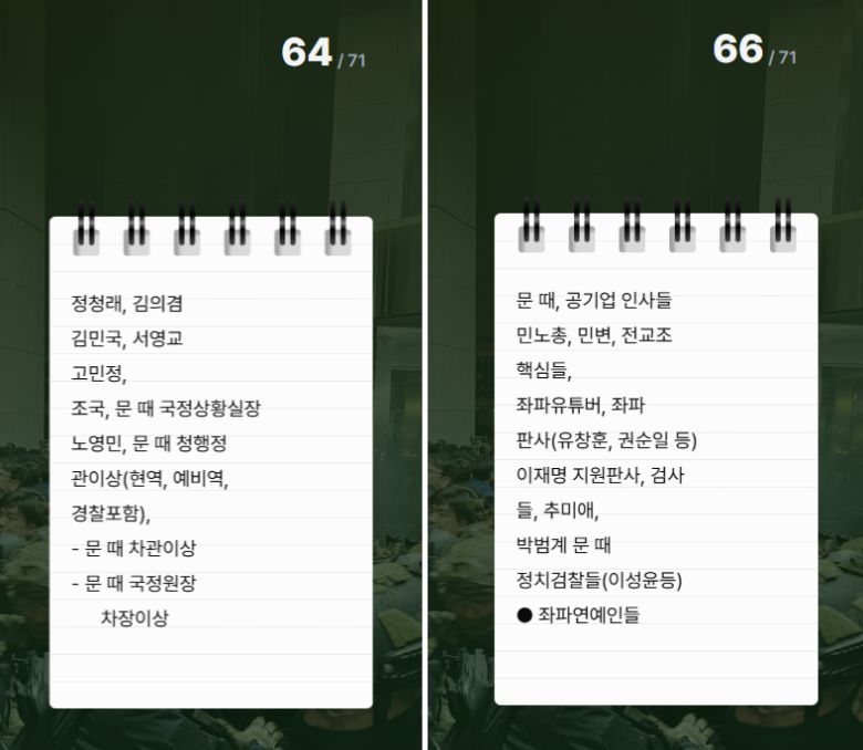‘수거 대상’, 즉 체포 대상에서 가장 많이 등장하는 표현은 ‘문 때’로 ‘문재인 정부 때’의 줄임말로 해석되며 총 11회 등장한다. ‘문 때 차관 이상’, ‘문 때 국정원장’ 등 문재인 정부에서 근무했던 사람들을 특정해 체포 대상에 포함시켰다. 반대 세력에는 ‘좌파’라는 딱지를 붙여 분류했다. 66쪽에는 ‘좌파 유튜버’부터 ‘좌파 판사’, ‘좌파 연예인들’이 수거 대상에 포함됐다.A급은 연평도, B~D급은 별도 수집소