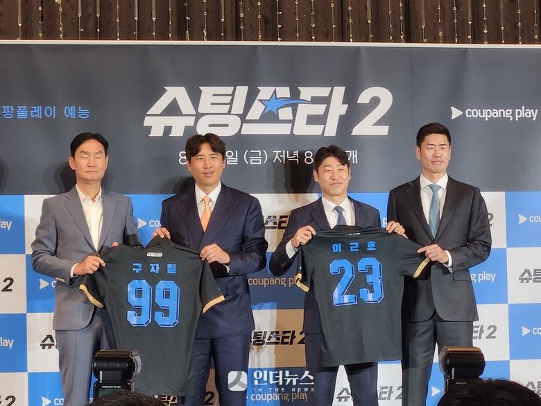 쿠팡플레이는 28일 더 링크 서울 트리뷰트 포트폴리오 호텔에서 '슈팅스타' 시즌 2 제작발표회를 열었습니다. 슈팅스타는 은퇴한 레전드 플레이어들의 이야기를 다룬 축구 예능으로 오는 29일 오후 8시 시즌 2 첫 공개를 앞두고 있습니다. 이날 현장에는 슈팅스타를 연출한 조효진 PD와 최용수 감독, 설기현 수석코치에 이어 올 시즌 새롭게 팀에 합류한 구자철과 이근호가 참석했습니다.