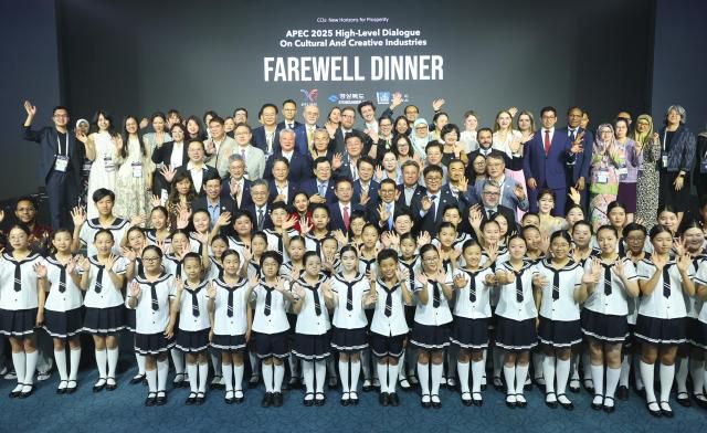 지난 27일 열린 ‘2025 APEC 문화산업고위급대화’ 대표단 환송 만찬 단체 기념 촬영 장면. [사진=경상북도]