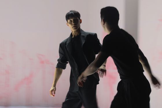 28일 서울 종로구 세종문화회관 S시어터에서 열린 김성훈 on Sync Next 25 'Pink' 언론공개 및 기자간담회에서 출연진이 주요 장면을 시연하고 있다. 무용수들은 신체적 폭력은 물론 자해, 노출 등의 행위를 적나라하게 보여준다. 연합뉴스