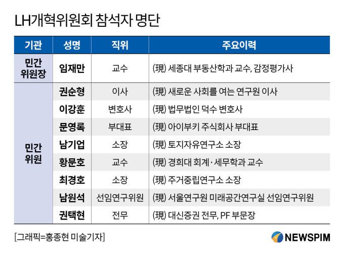 한편 이날 개혁위원회의 민간위원장으로는 임재만 세종대학교 부동산학과 교수가 위촉됐다. 임 위원장 역시 이날 "국토부와 함께 LH의 혁신을 위해서 국민의 땅을 국민의 품으로 다시 사용할 수 있도록 하겠다"며 또한 "국민들이 안정적인 제도를 운영할 수 있도록 (개혁위원회) 여러분들의 많은 지혜를 모아서 열심히 조언하겠다"고 말했다.
