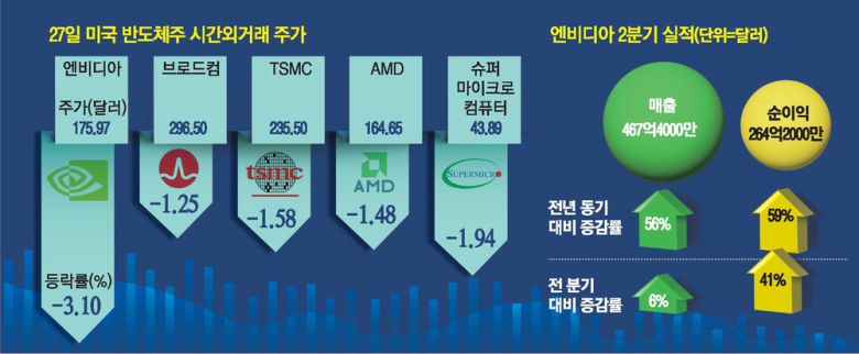 그러나 이 같은 호실적에도 엔비디아 주가는 시간외거래에서 3.10% 하락하며 175.97달러를 기록했다. 이 여파로 브로드컴(-1.25%), TSMC(-1.58%), AMD(-1.48%) 등 뉴욕 증시에 상장된 주요 반도체 기업 주가가 시간외거래에서 일제히 약세를 보였다. 슈퍼마이크로컴퓨터(-1.94%) 등 AI 서버 관련 기업들 주가도 하락했다. 시장에선 미국의 대중 수출 규제에 따른 여파가 가시화됐다는 점에 주목했다. 2분기 호실적보다 중국 시장의 불확실성에 대한 우려가 더 부각됐다는 것이다.
