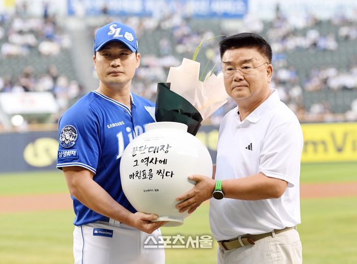 삼성 오승환(왼쪽)이 28일 잠실구장에서 열린 2025 KBO리그 삼성과 두산의 경기에 앞서 진행된 은퇴 투어 행사에서 두산 김태룡 단장으로부터 달항아리를 선물로 받은 뒤 기념촬영을 하고 있다. 2025. 8. 28.