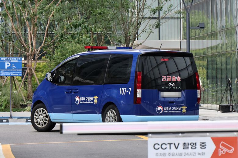 김건희 여사가 탑승한 호송차가 28일 민중기 특별검사팀 사무실이 마련된 서울 종로구 KT광화문빌딩으로 들어가고 있다. 연합뉴스 |