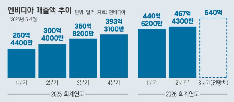 엔비디아는 3분기 매출이 전년 동기보다 약 54% 늘어난 540억달러(약 75조원)에 이를 것으로 전망했다. H20 중국 수출을 반영하지 않은 수치다.