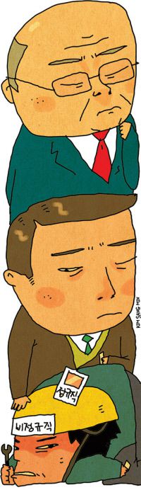 거시적으로 보면 지금의 노동시장 이중구조는 그동안 정부와 경영자들이 노동문제를 경제성장과 사회적 가치 진화의 관점에서 보지 않은 것이 문제의 시작이다. 또한 노동자들의 다양한 분노를 늘 ‘잿밥’에만 관심 있는 것으로 단순화했고, 색안경을 끼고 다루어왔다. 한 예로 일부 기업과 노동조합은 우월적 지위를 이용해서 협력회사 노동자 몫을 빼앗아 원청의 정규직에게 더 주는 방식으로 대응해왔다. 이뿐만이 아니다. 심지어 정규직 일자리 보호를 위해 저임금과 해고라는 노동의 유연성을 비정규직에게 부담 지워왔다. 이러한 관계를 ‘노사담합’으로 표현한 연구서가 많이 있다.