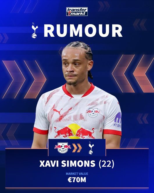 독일 '빌트'도 시몬스의 토트넘행에 무게를 실었다. 매체는 "시몬스는 이미 영국에 있다! 그는 올여름 라이프치히를 떠날 예정이며 런던에 있다. 이제 모든 게 시몬스의 토트넘 이적을 시사하고 있다. 그와 라이프치히는 이번 주 목요일 토트넘에서 추가 협상을 진행할 예정이며 재정 조건 또한 논의될 예정"이라고 보도했다.