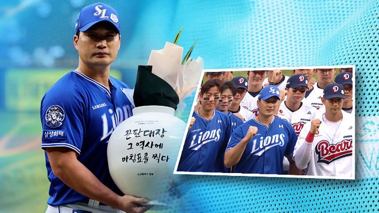 올 시즌을 끝으로 은퇴하는 프로야구 삼성 오승환 투수가 두산 선수단과 은퇴 투어 행사에서 달항아리를 선물 받았습니다.