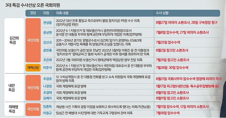 권 의원을 시작으로 3대 특검의 수사선상에 올라 있는 국민의힘 의원들에 대한 수사도 본격화할 것으로 보인다. 이날까지 특검에서 피의자 신분으로 조사받거나, 압수수색을 받은 의원은 알려진 것만 7명이다. 국민의힘 윤상현 의원과 개혁신당 이준석 대표(당시 국민의힘 소속)는 2022년 6·1 지방선거 및 재보궐선거 당시 윤석열 전 대통령 부부와 함께 공천에 부당하게 개입했다는 업무방해 혐의로 각각 김건희 특검에 입건됐다. 국민의힘 김선교 의원은 2011∼2016년 경기도 양평군수로서 김건희 일가가 운영하는 ESI&D에 공흥지구 개발사업 특혜를 줘 양평군에 손실을 입혔다는 의혹으로 지난달 25일 압수수색 대상이 됐고, 소환조사도 임박했다는 평가다.