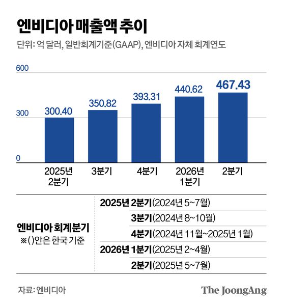 27일(현지시간) 엔비디아는 2분기 매출 467억4300만 달러(약 65조원), 주당 순이익 1.05달러(1463원)를 기록했다고 밝혔다. 글로벌 시장조사업체인 LSEG가 집계한 월스트리트 매출 전망치(460억6000만 달러)와 주당 순이익 전망치(1.01달러)를 소폭 웃도는 수치다. 전년 동기에 비하면 매출은 56%, 순이익은 59% 증가했다.