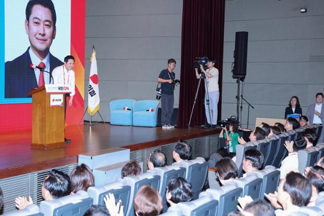 장동혁 국민의힘 대표가 28일 오후 인천 인천국제공항공사 인재개발원에서 열린 국민의힘 연찬회에서 의원들에게 인사하고 있다. 뉴스1
