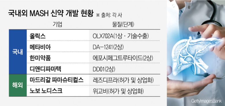 국내에서는 올릭스, 메타비아, 한미약품, 디앤디파마텍 등이 MASH 치료제 후보물질을 1~2상 단계에서 개발하고 있다.