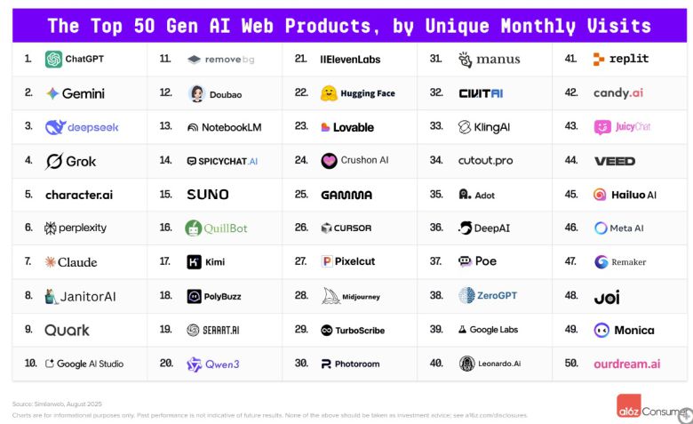 a16z는 2023년 하반기부터 반기마다 글로벌 트래픽을 기반으로 웹(50개)과 앱(50개) 플랫폼에서 가장 많이 사용되는 AI 서비스 순위와 트렌드를 분석해 발표한다.