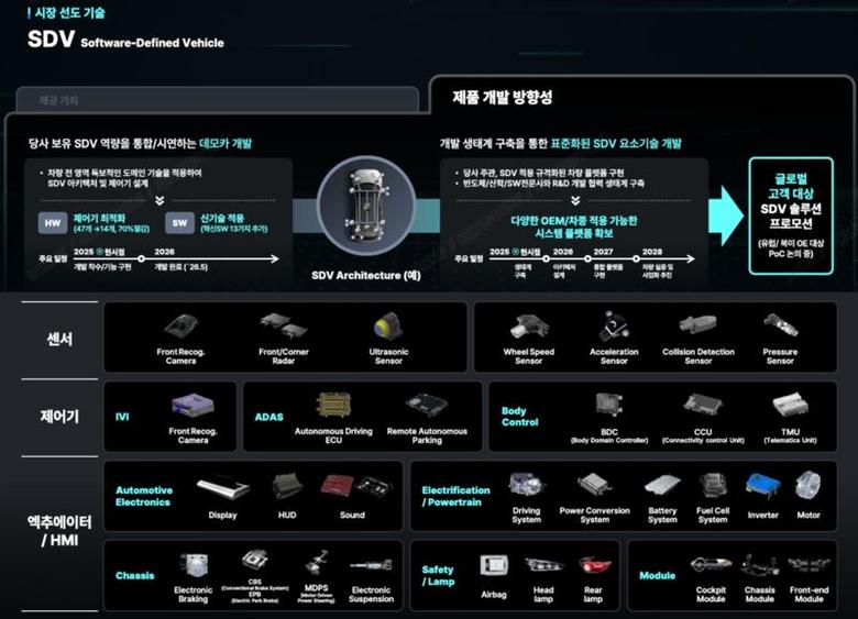 현대모비스는 지난 27일 오후 서울 여의도 페어몬트 호텔에서 '2025 CEO 인베스터 데이'를 열고 SDV 플랫폼 관련 2026년 5월 제어기 숫자를 47개에서 14개로 최적화하고, 13가지 소프트웨어 기술이 추가된 데모카 개발을 완료하겠다고 설명했다. 2027년에는 통합 플랫폼을 구현하고, 2028년에 차량 실증 및 사업화를 한다는 계획이다. 이와 관련 유럽 및 북미 완성차 업체 대상 프로모션을 진행 중이라고 설명했다.