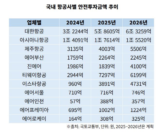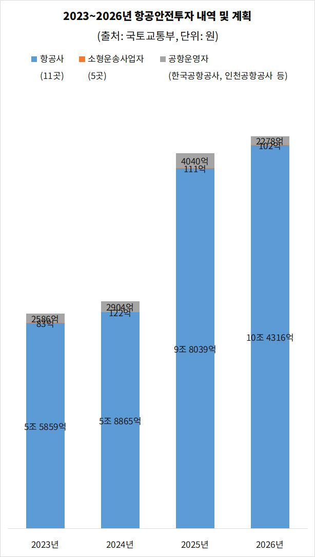 공시에 따르면 항공안전투자 총액은 2022년 4조 2298억원에서 2023년 5조 8445억원으로 38.2% 늘어난 데 이어 3년 연속 증가했다. 국토부는 이 같은 확대 기조가 앞으로도 지속될 것으로 보고 있다. 실제 항공안전 투자 예정액을 보면 올해 9조 7928억원, 2026년 10조 4214억원 등으로 증가 흐름을 보이고 있다.