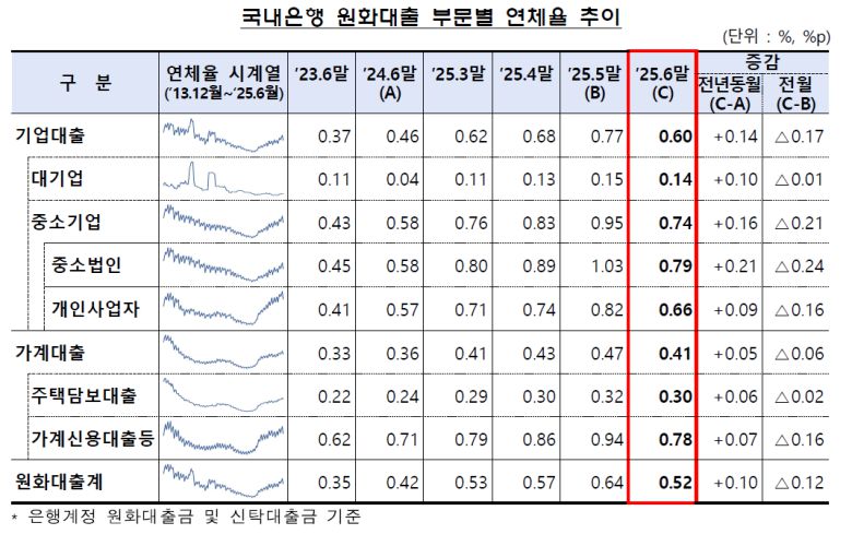 29일 금융감독원에 따르면 6월 말 국내은행의 원화대출 연체율(1개월 이상 원리금 연체 기준)은 0.52%로 집계됐다. 이는 5월 말(0.64%)보다 0.12%포인트(p) 낮아진 수치다. 다만 지난해 같은 달(0.42%)보다는 0.10%p 높았다.