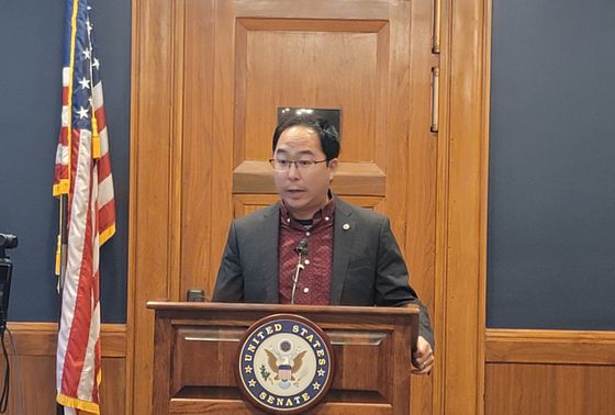 앤디 김 미국 민주당 연방 상원의원(뉴저지)이 28일(현지시간) 워싱턴 DC 상원 의원회관에서 가진 한국 특파원과의 간담회에서 취재진 질문에 답하고 있다. 워싱턴=김형구 특파원