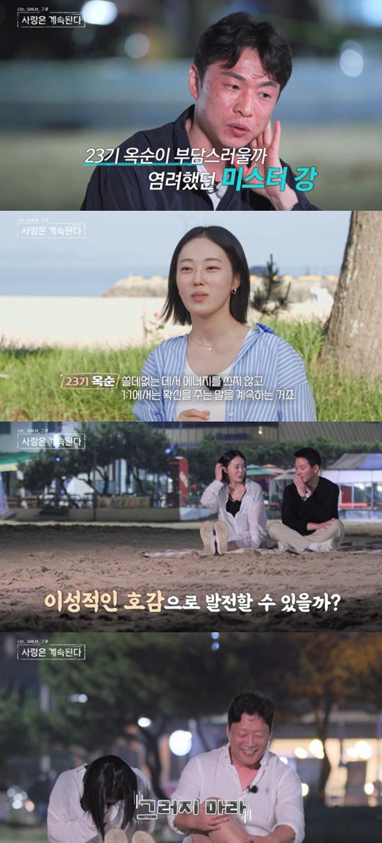 이에 23기 옥순은 "사람들 있을 때는 쓸데없는 에너지를 쓰지 않고 1대1에서는 확신을 주는 말을 계속 하신다. 절 불안하지 않게 하는 방법을 아는 것 같다"며 호감도를 높였다.