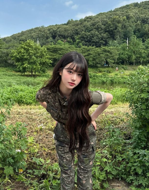 공개된 사진 속 장원영은 자연을 배경으로 군복일 입고 여러 자세를 취하는 모습이 담겼다.