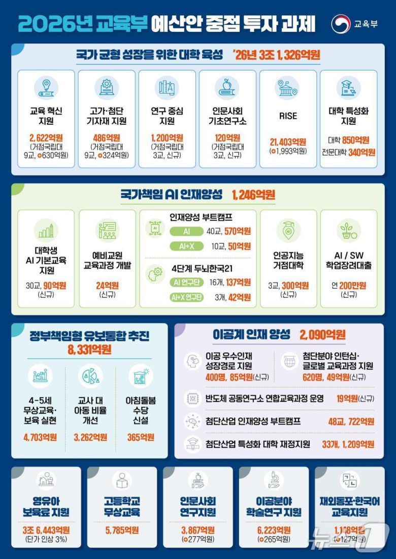 교육부는 28일 국무회의에서 의결된 새 정부 국정과제 추진을 위한 2026년 예산안 106조 2663억 원을 편성했다고 밝혔다. 이는 올해보다 약 3조6000억 원(3.5%) 늘어난 규모다.