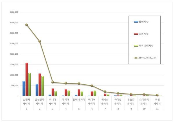 3위, 위니아 세탁기 브랜드는 참여지수 66,797 소통지수 355,614 커뮤니티지수 232,568이 되면서 브랜드평판지수 654,979로 분석됐다. 지난 7월 브랜드평판지수 956,195와 비교해보면 31.50% 하락했다.