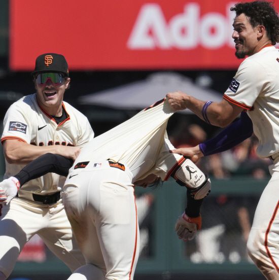 샌프란시스코 동료들은 이정후에게 달려 나와 승리 세리머니를 펼쳤다.