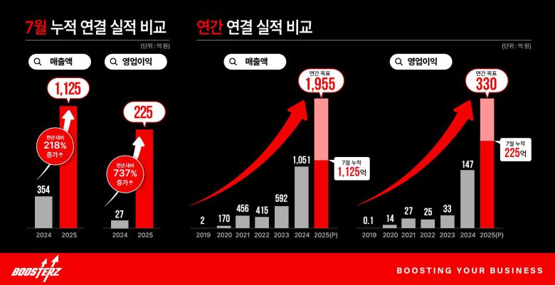 부스터즈는 올해 7월 결산 기준 누적 연결매출 1,125억 원, 영업이익 225억 원을 달성했다. 매출은 전년 동기 대비 약 771억 원(218%) 증가했으며, 영업이익 역시 약 198억 원(737%) 증가한 것으로 나타났다. 이로써 부스터즈는 7개월 만에 창사 이래 최대 실적이었던 지난해 연간 실적을 넘어섰고(매출 1,051억 원, 영업이익 147억 원) 영업이익 역시 연간 누적 최대 실적 달성으로 올해 목표초과 달성도 가능할 것으로 기대하고 있다.