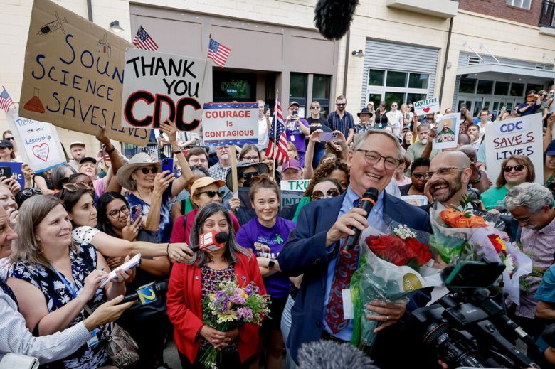 질병통제예방센터의 핵심 간부 세 사람도 모나레즈 센터장의 해임에 항의하며 사직서를 던졌다. 센터 산하 국립면역호흡기센터의 소장직을 던진 디미트리 다스칼라키스 박사도 “백신에 대한 잘못된 결정 때문에 어린이들이 해를 입을 것이 두렵다”며 “공중보건을 해체하고도 여전히 작동할 것이라고 기대하지 마라”고 일갈했다. 질병통제예방센터 직원들은 이날 애틀란타에 있는 센터를 떠나는 고위 간부들에게 꽃다발을 안기고 박수를 보내며 “알에프케이(RFK·케네디 장관)가 아닌 유에스에이(USA·미국)”라고 구호를 외쳤다.