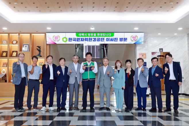 한국원자력환경공단 이사진들이 태백시청에서 단체사진을 촬영하고 있다.