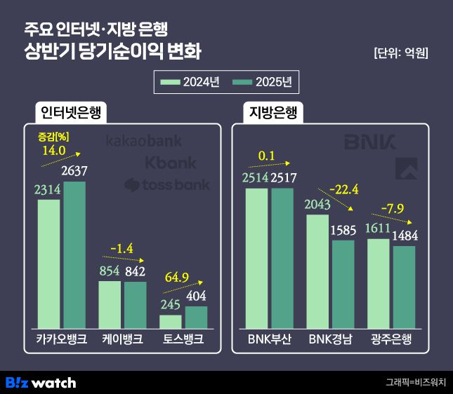 인터넷은행이 올해 상반기도 질주했다. 업계 1위인 카카오뱅크는 지방은행 실적을 앞질렀고, 토스뱅크는 65%에 이르는 성장세를 기록했다. 반면 지방은행 분위기는 다소 암울하다. 부산은행이 겨우 지난해와 비슷한 성적표를 받았지만, 다른 은행들은 역성장을 피하지 못했다.