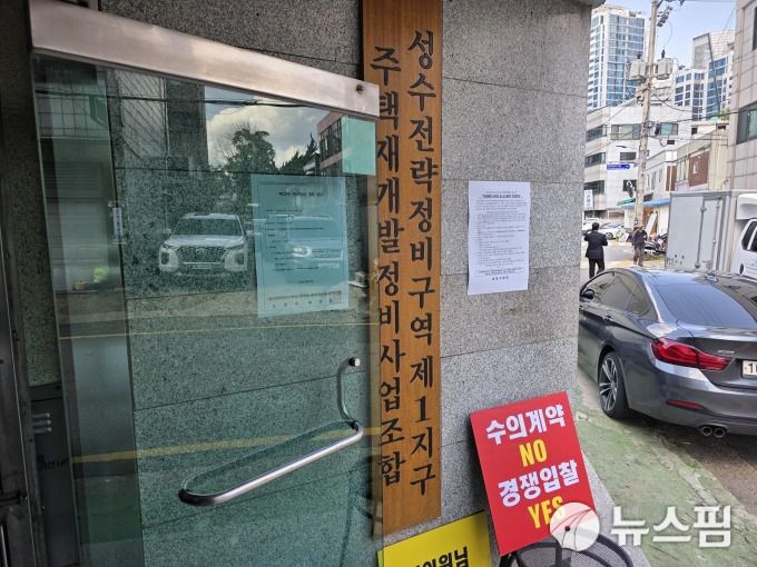 [서울=뉴스핌] 송현도 기자 = 29일 정비업계에 따르면 성수전략정비구역 제1지구 주택재개발정비사업조합(조합)이 이날 오후 2시에 개최한 현장설명회에서 현대건설과 HDC현대산업개발이 불참했다. 사진은 조합 사무실 앞에 놓인 수의계약 반대 플래카드. 2025.08.29 dosong@newspim.com |