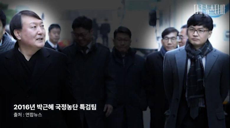 2016년 박근혜 국정농단 특검팀 당시 촬영된 모습. 왼쪽이 당시 윤석열 수사팀장. 오른쪽에 한동훈 검사와 그 뒤로 조상원 검사의 모습이 보인다.