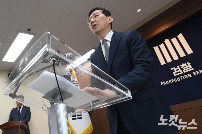조상원 당시 서울중앙지검 4차장이 지난해 10월 17일 오전 서울 서초구 중앙지검 브리핑실에서 '대통령 배우자의 도이치모터스 시세조정 가담 의혹 사건 수사결과'를 발표하고 있다. 중앙지검은 이날 브리핑을 통해 해당 사건과 관련하여 김건희 씨를 불기소 처분한다고 밝혔다. 황진환 기자