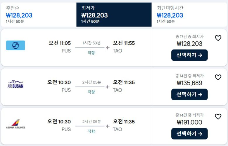 29일 여행 가격 비교 플랫폼 스카이스캐너에 따르면 10월 18일 부산~중국 칭다오 항공편은 오전 11시 5분에 출발하는 대한항공편이 12만8203원으로 가장 저렴하다. 대한항공은 지난 3월 말부터 약 한 달간 이 노선 운항을 잠시 중단했다가, 4월 말부터 5월 말까지 주 4회 운항했다. 지금은 주 7회 운항 중이다.
