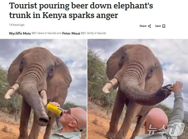 (서울=뉴스1) 박형기 기자 = 케냐에서 코끼리 코에 맥주를 들이붓는 관광객이 누리꾼들의 뭇매를 맞고 있다고 BBC가 29일 보도했다.