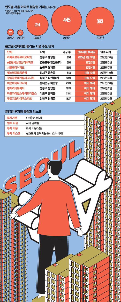 분양권은 아파트 분양에 청약해 당첨으로 취득한 권리를 말한다. 초기 계약금 10~20%를 납부한 뒤 중도금과 잔금을 대출 등을 통해 불입하는 경우가 많다. 투기과열지구인 서울 강남 3구(강남·서초·송파구)와 용산구는 분양권 전매제한이 3년, 과밀억제권역(서울·인천·경기 일부)은 1년이 적용된다.