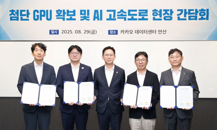 배경훈 과학기술정보통신부 장관이 29일 카카오 데이터센터 안산을 찾아 카카오, NHN클라우드, 네이버클라우드, 정보통신산업진흥원(NIPA)과 ‘AI 고속도로 협약식 및 간담회’를 열었다. 이번 행사는 새 정부 핵심 과제인 ‘AI 고속도로 구축’ 진행 상황을 점검하고 향후 계획을 공유하기 위해 마련됐다. 배 장관은 모두 발언을 통해 “올해 1만3000장, 내년 1만5000장을 확보해 2030년까지 GPU 5만 장을 마련하겠다”면서 “정부가 마중물이 될 테니 기업들도 적극 투자해 AI 생태계 활성화에 힘써달라”고 당부했다.