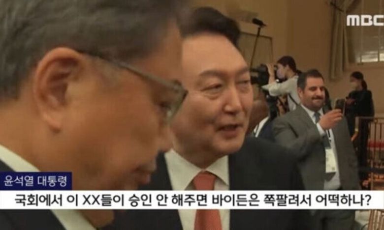 앞서 MBC는 윤 전 대통령이 2022년 9월 22일 미국 뉴욕에서 조 바이든 당시 미 대통령 주최로 열린 글로벌펀드 제7차 재정공약회의를 마치고 회의장을 떠날 때 주변 참모진에게 말하는 모습이 담긴 영상을 보도하며 ‘(미국) 국회에서 이 XX들이 승인 안 해주면 바이든이 쪽팔려서 어떡하나’라는 자막을 달았다.