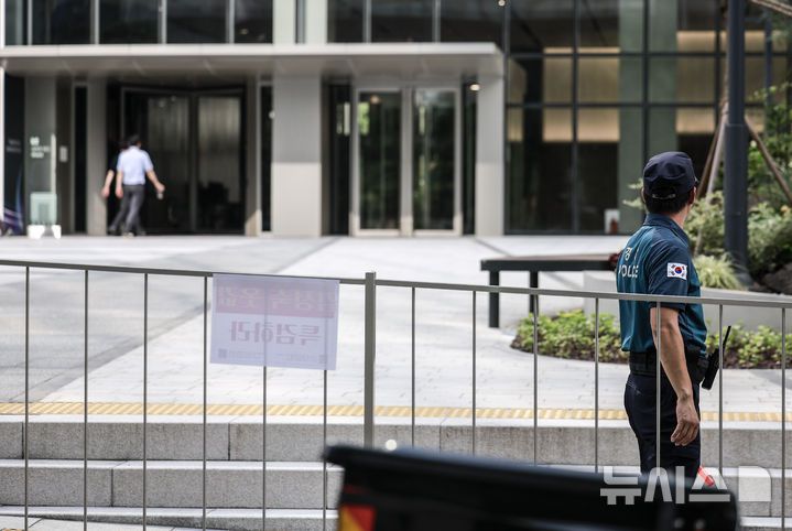 [서울=뉴시스] 정병혁 기자 = 29일 서울 종로구 김건희 특검팀(특별검사 민중기) 사무실 앞에 경찰이 근무를 서고 있다. 김건희 특검팀은 이날 특정범죄가중처벌법상 알선수재, 자본시장법 및 정치자금법 위반 혐의로 김건희 여사를 서울중앙지법에 구속 기소했다고 밝혔다. 2025.08.29. jhope@newsis.com |