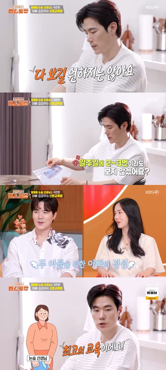 김강우는 "어린이 신문을 같이 시켰다. 제가 어렸을 때는 학교에서 매일 봤다"라고 밝혔다. 또 "다 보길 원하지는 않는다. 이렇게 던져놓으면 일주일에 2~3번은 볼 거다. 절대 억지로 강요하지 않는다. 화장실에도 붙여놓는다. 안 봐도 되지만 보게 된다. 그리고 저랑 얘기를 나눈다"라며 비결을 공개했다.