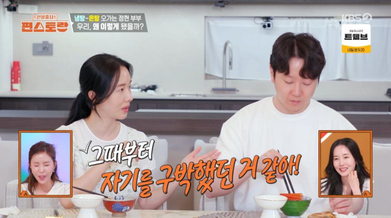 식사 중 부부의 진솔 토크가 공개됐다. 이정현은 "방송 보니까 내가 자기한테 너무 못되게 하더라. 너무 미안하다. 이제 부드럽게 말할게"라며 사과했다. 그러나 남편은 "몰랐어?"라며 냉랭한 태도를 보였다.