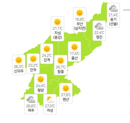 북한날씨, 평양·개성 "24~27도" 백두산날씨 150mm 비소식