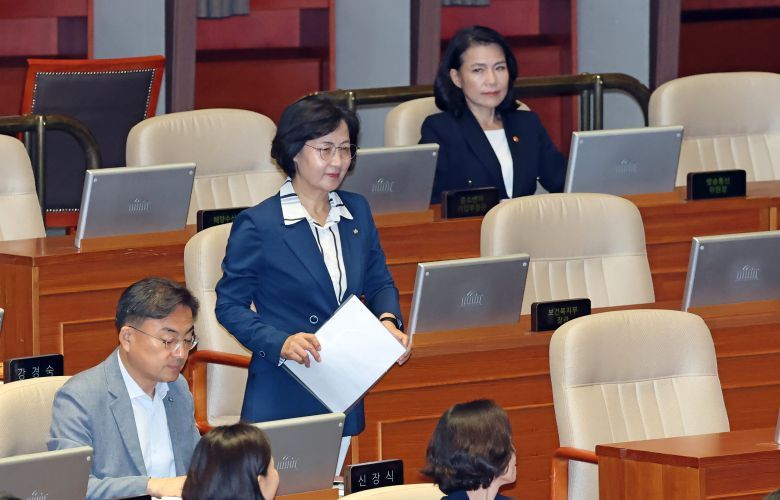 지난 21일 국회 본회의에서 법제사법위원장으로 선출된 추미애(왼쪽) 더불어민주당 의원이 감사 인사를 위해 발언대로 이동하고 있다. 이 모습을 본회의장에 출석해 있었던 이진숙 방송통신위원장이 지켜보고 있다./남강호 기자 |