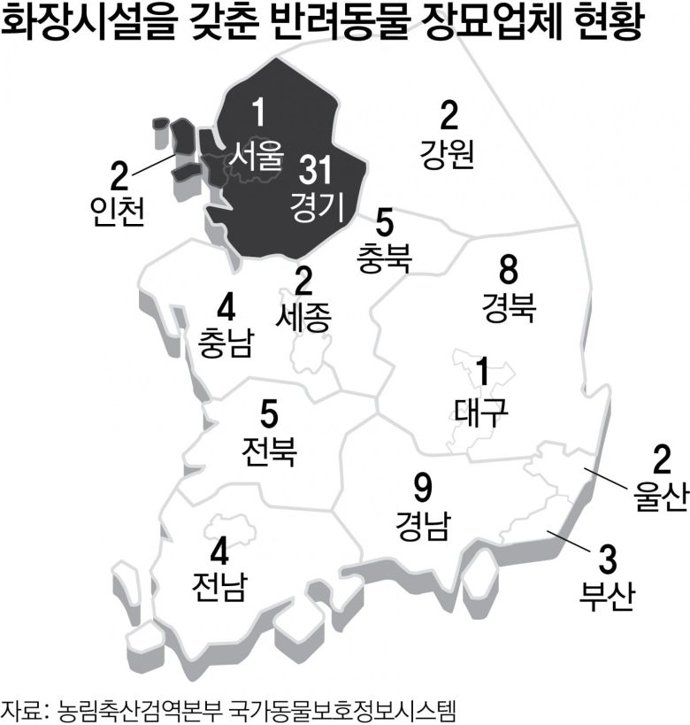 반려동물 장묘시설에 대한 접근성 문제도 여전히 크다. 농림축산식품부에 따르면 이달 27일 기준 전국의 반려동물 장묘업체는 83곳으로, 2019년(44곳)에 비해 약 2배로 증가했다. 이 중 화장시설을 갖춘 곳은 79곳인데, 절반 가까운 34곳이 수도권(서울, 경기, 인천)에 집중돼 있다. 비수도권에서는 이용이 쉽지 않다. 특히 제주도에는 화장이 가능한 장묘시설이 없어 비행기나 배편을 이용해 경기 김포시나 경남 김해시로 ‘원정 장례’를 가는 실정이다.