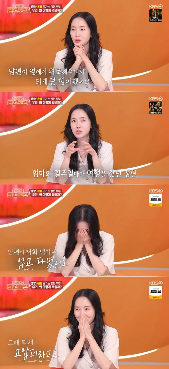 이정현은 "결혼할 때는 엄마가 아픈지 모르다가, 결혼식 끝나고 아프셨다"라고 고백했다. 이정현의 남편은 "그리고 (장모님이) 2년을 투병하시다 돌아가셨다"라고 덧붙였다. 이정현은 "그래서 신혼이 되게 슬펐다. 신혼여행 가서도 계속 울었다. 영화 끝내고 신혼여행을 갔는데 내가 계속 울었다"라며 당시를 회상했다.
