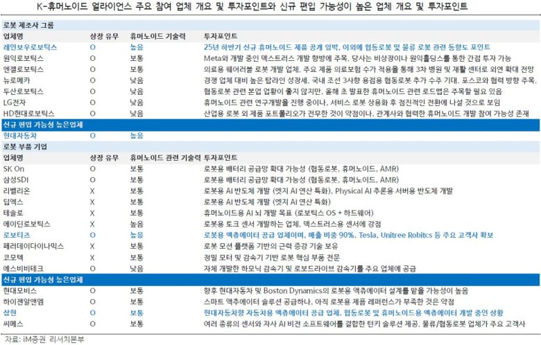 정부는 하반기부터 재정 지원을 포함한 후속 정책을 집행할 계획이며, K-휴머노이드 얼라이언스 규모 확대가 그 시작점이 될 것으로 예상된다. 실제로 얼라이언스 참여 업체가 추가되면서 기존 5년간 1조 원 규모였던 투자금액이 상향될 가능성이 높다. 이에 향후 정부 정책이 구체화하는 시점에 휴머노이드 관련 경쟁력을 갖춘 기업을 선별하는 과정이 중요해질 전망이다.