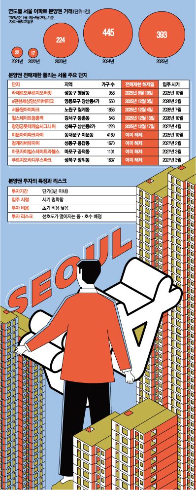 분양권은 아파트 분양에 청약해 당첨으로 취득한 권리를 말한다. 초기 계약금 10~20%가량을 납부한 뒤 중도금과 잔금을 대출 등을 통해 납부하는 경우가 많다. 투기과열지구인 서울 강남 3구(강남·서초·송파구)와 용산구는 분양권 전매제한이 3년, 과밀억제권역(서울·인천·경기 일부)은 1년이 적용된다.