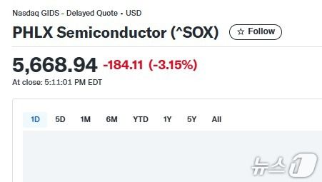 29일(현지 시각) 뉴욕증시에서 반도체지수는 3.15% 급락한 5668.94포인트를 기록했다.