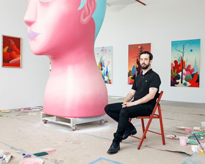작업실에서 풍경화와 조각 앞에서 앉은 니컬러스 파티. [Nicolas Party] |