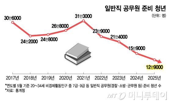 지난달 공개된 통계청 '경제활동인구조사 청년층 부가조사'에 따르면 지난 5월 기준 20~34세 비경제활동인구 가운데 조사 기간에 해당하는 1주일 동안 7급·9급 등 '일반직 공무원'(경찰·소방·군무원 포함) 시험을 준비한 이들은 12만9000명으로 전년(15만9000명) 대비 3만명 줄었다.